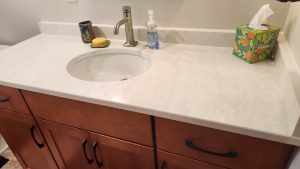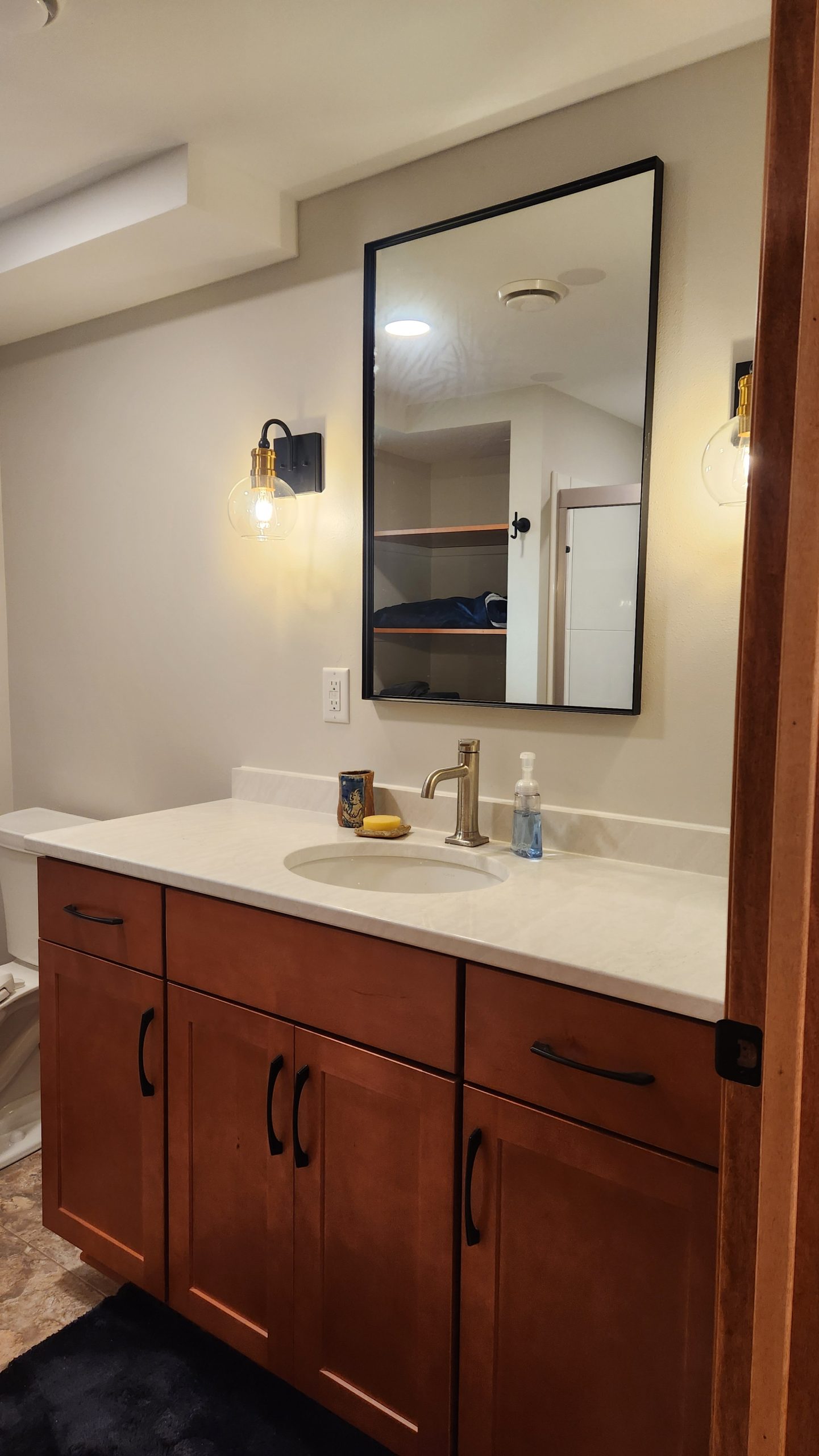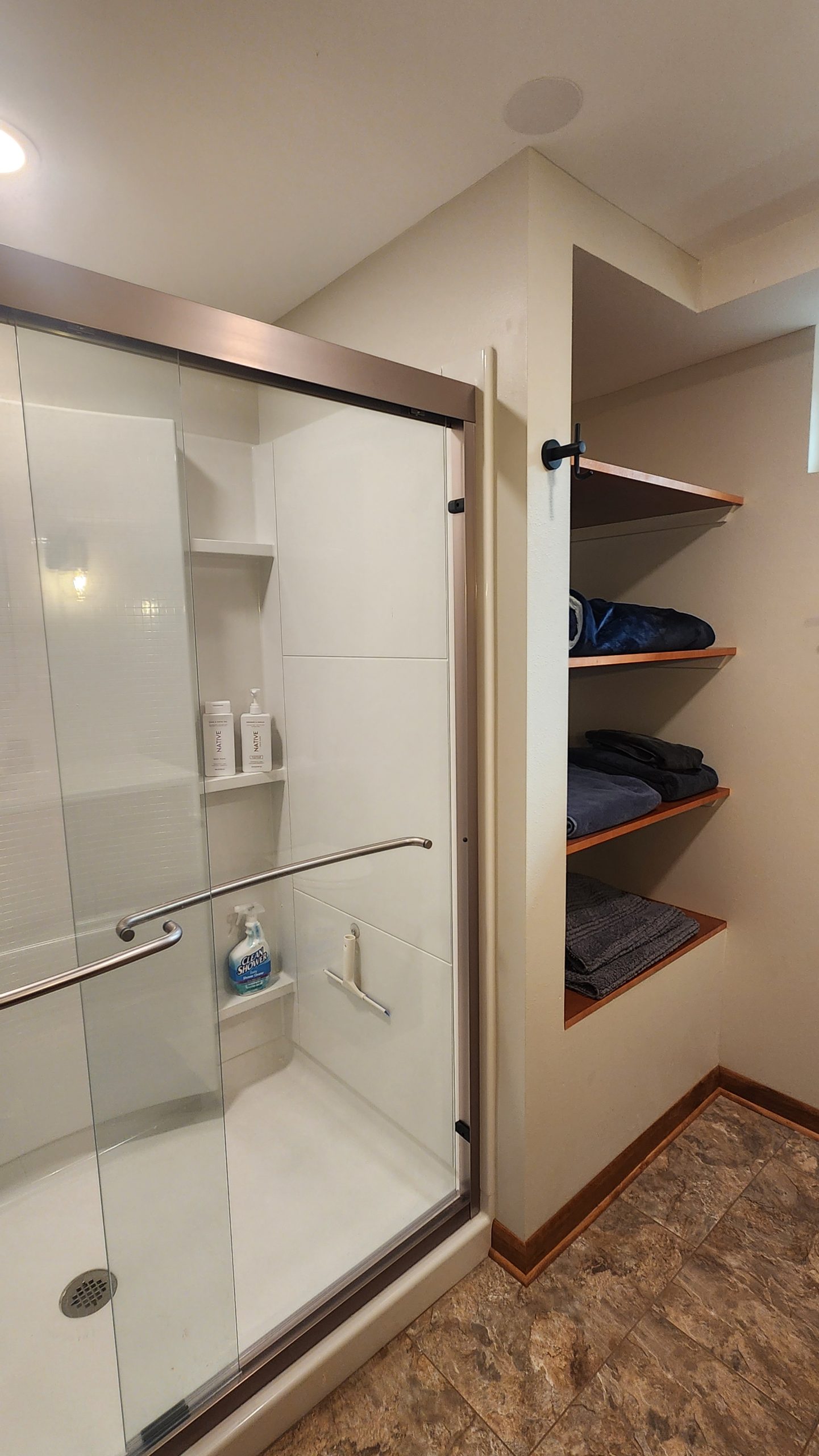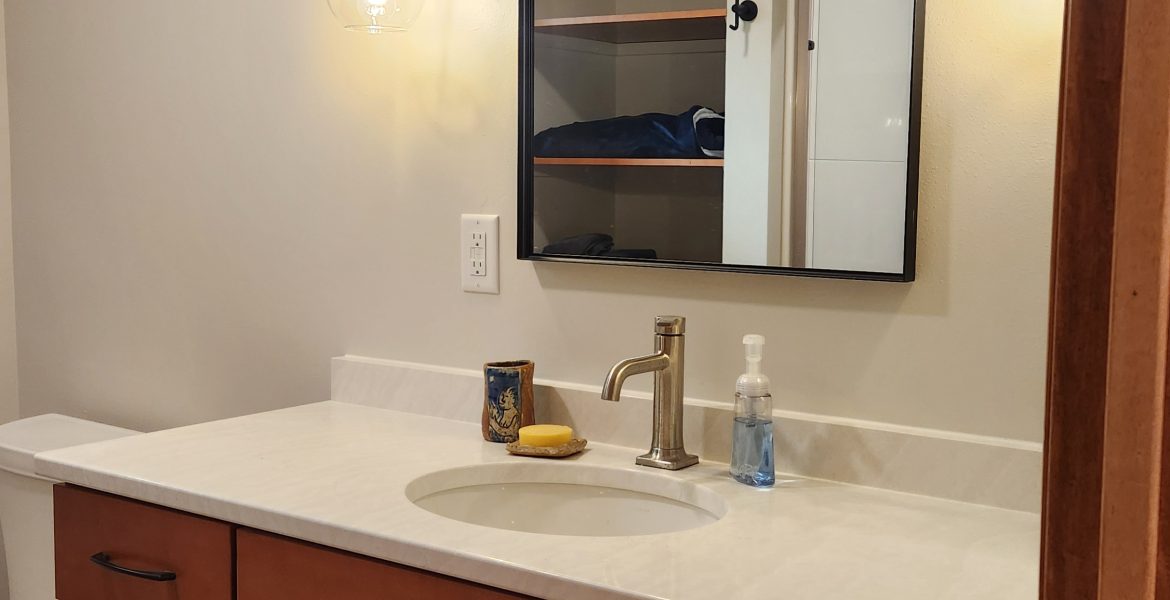 The bathroom ended up a nice size, with a shower module, 54″ vanity, and open shelving. LVT was selected for the floors for ease of cleaning.