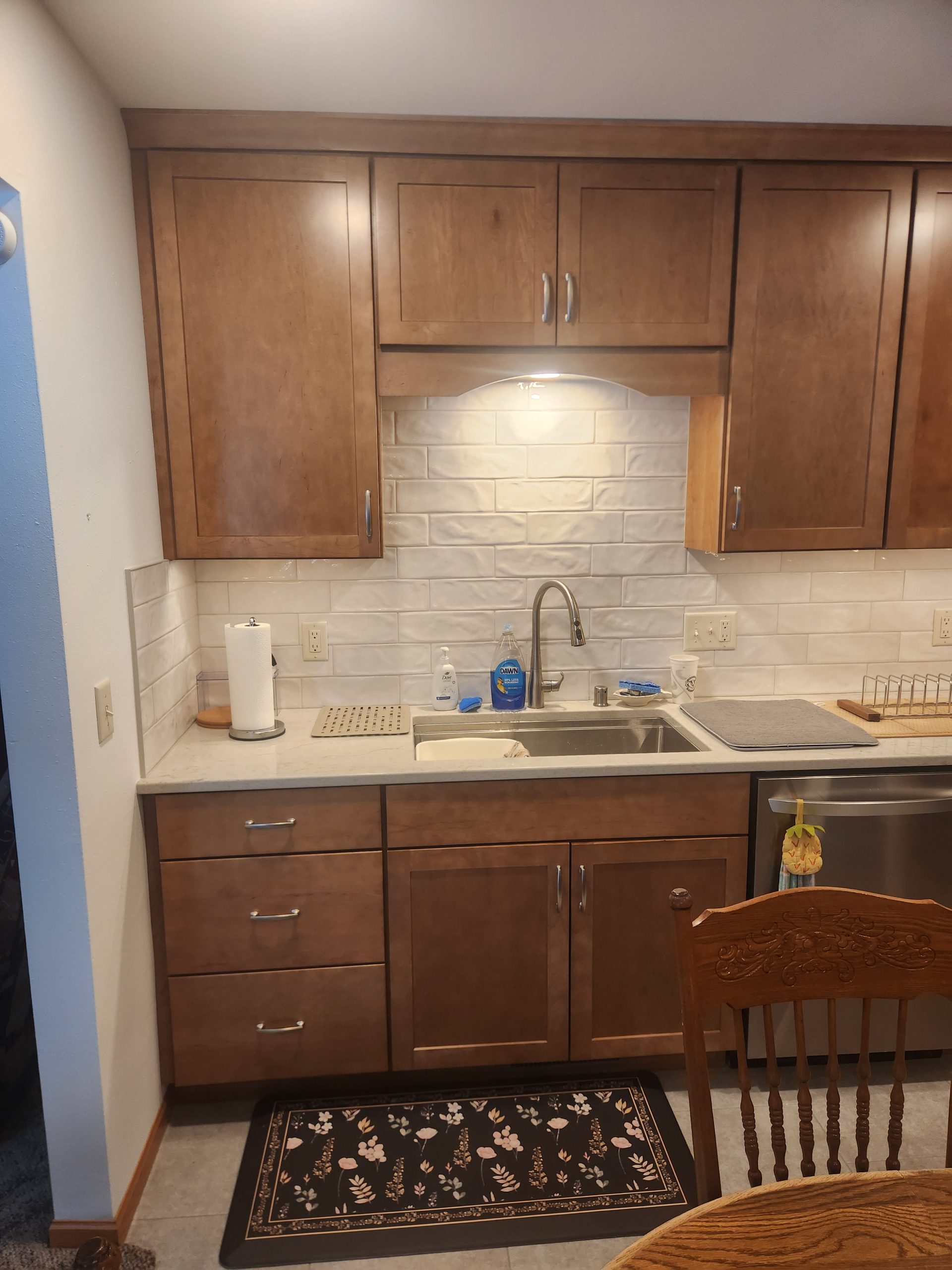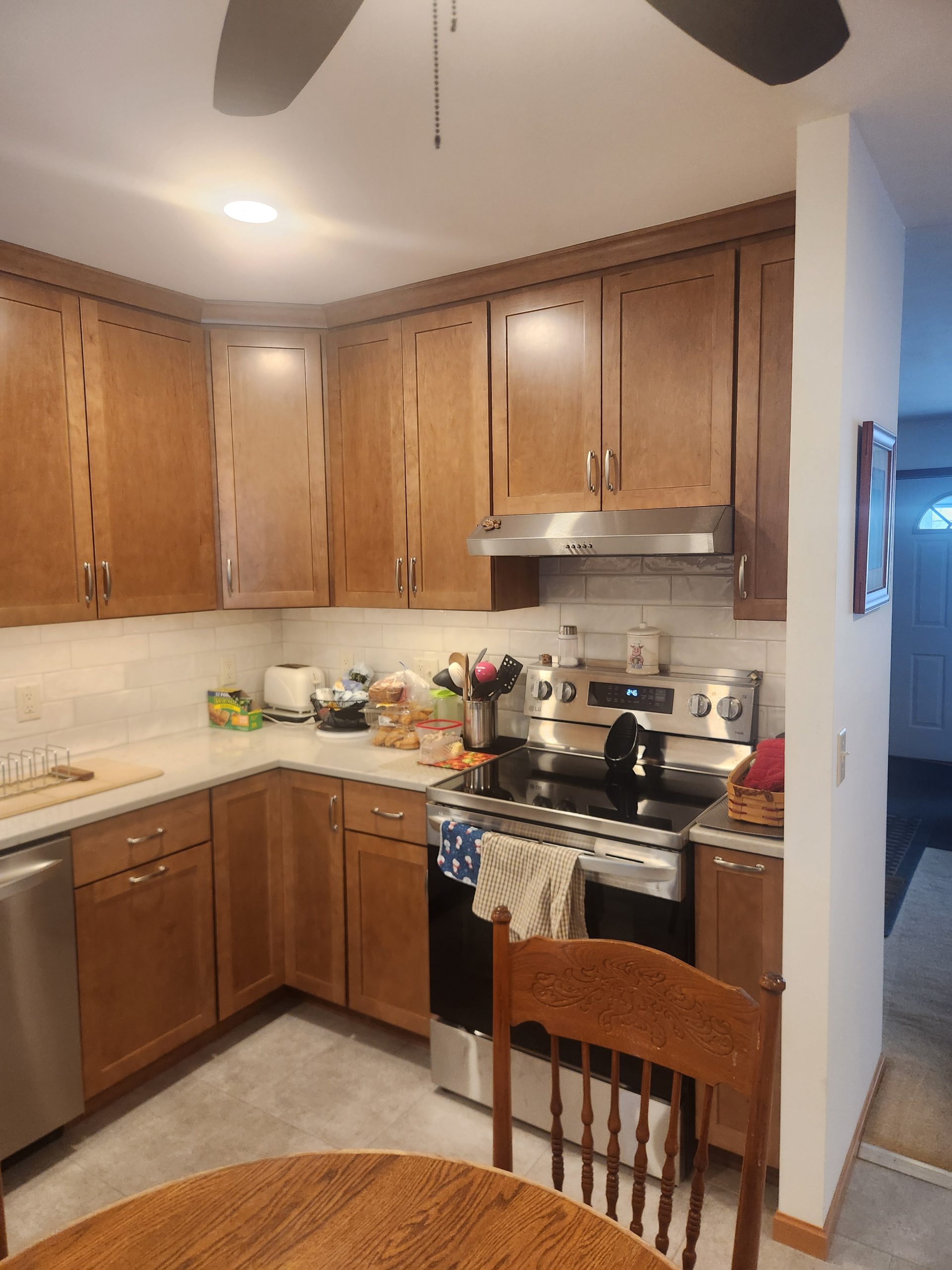 – Installed new cabinetry (Kemper in Maple Sahara), countertops (Quartz, Mackinaw), appliances, and plumbing