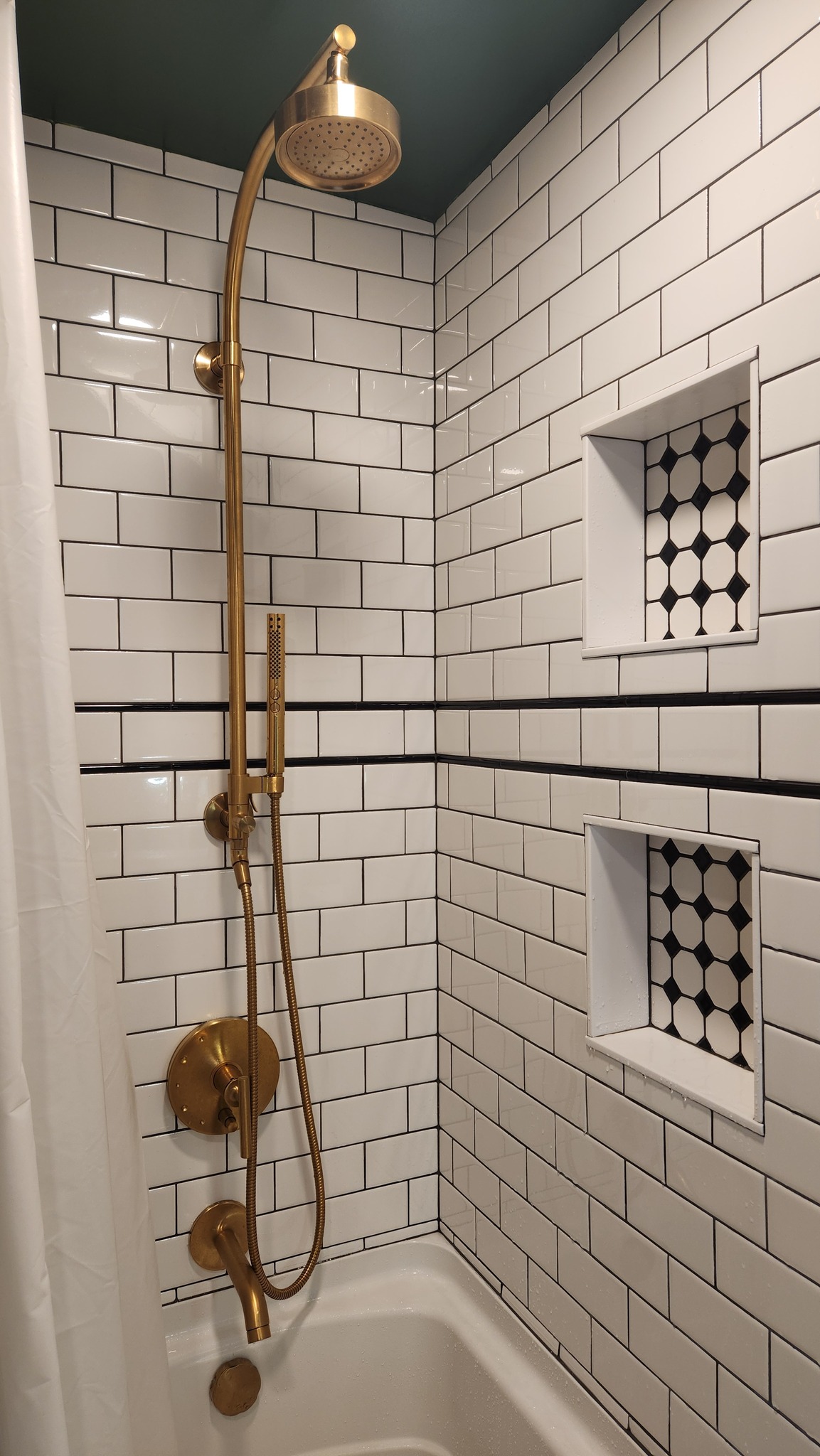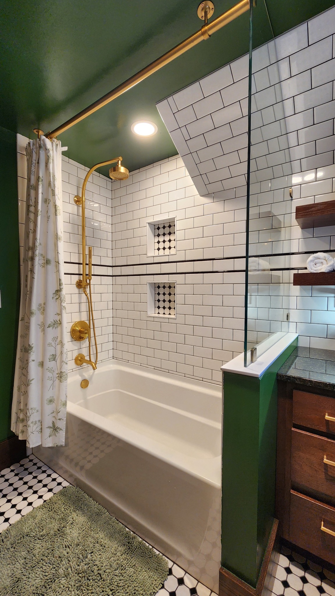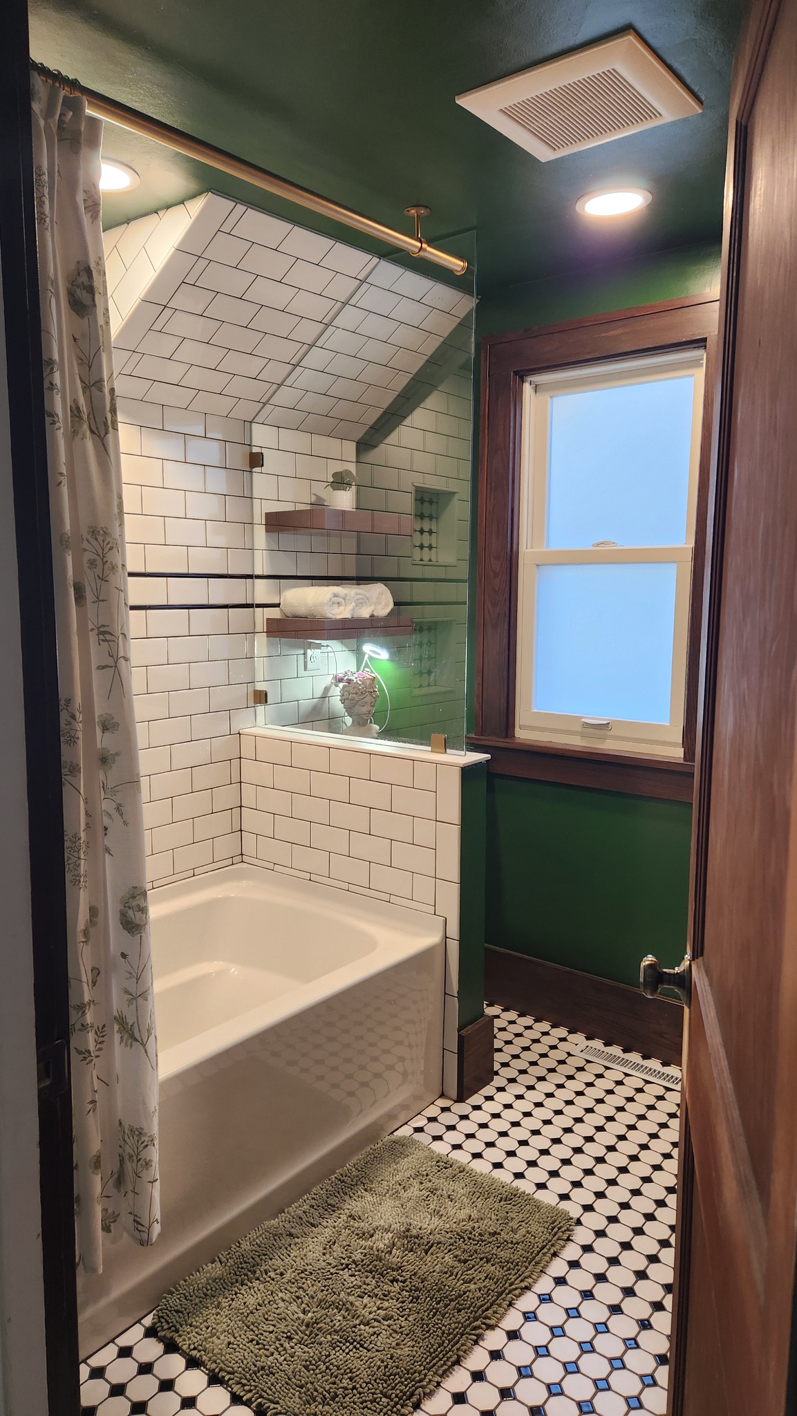 What an enjoyable space to use now! The storage and countertop space add function as well as the wonderful shower fixtures. The door just misses the cabinet and the roof line gives character to the shower tile.