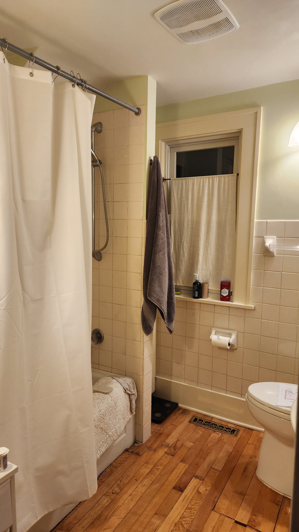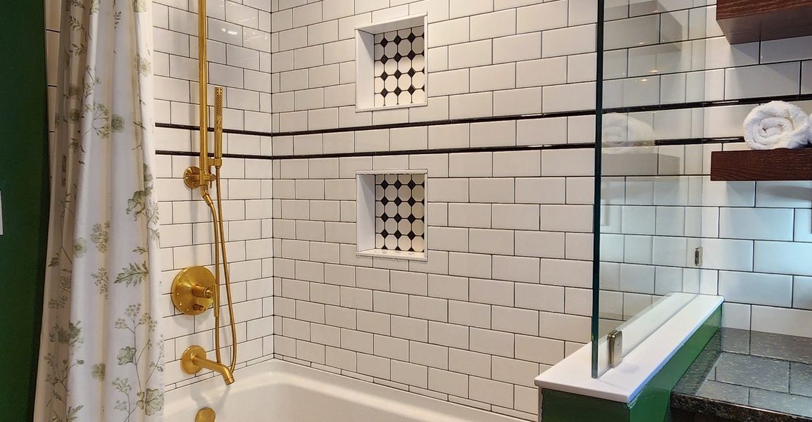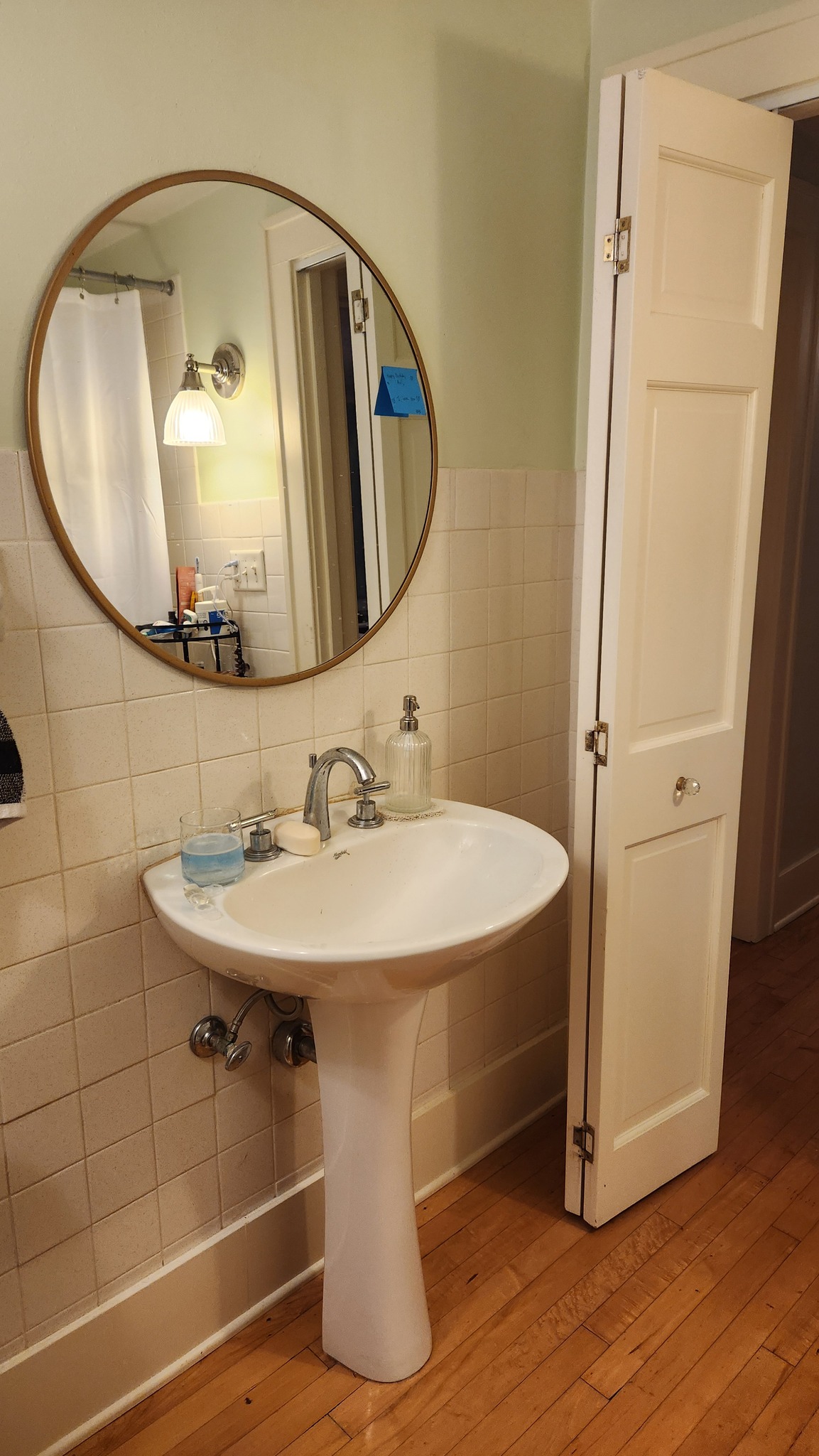 What an enjoyable space to use now! The storage and countertop space add function as well as the wonderful shower fixtures. The door just misses the cabinet and the roof line gives character to the shower tile.