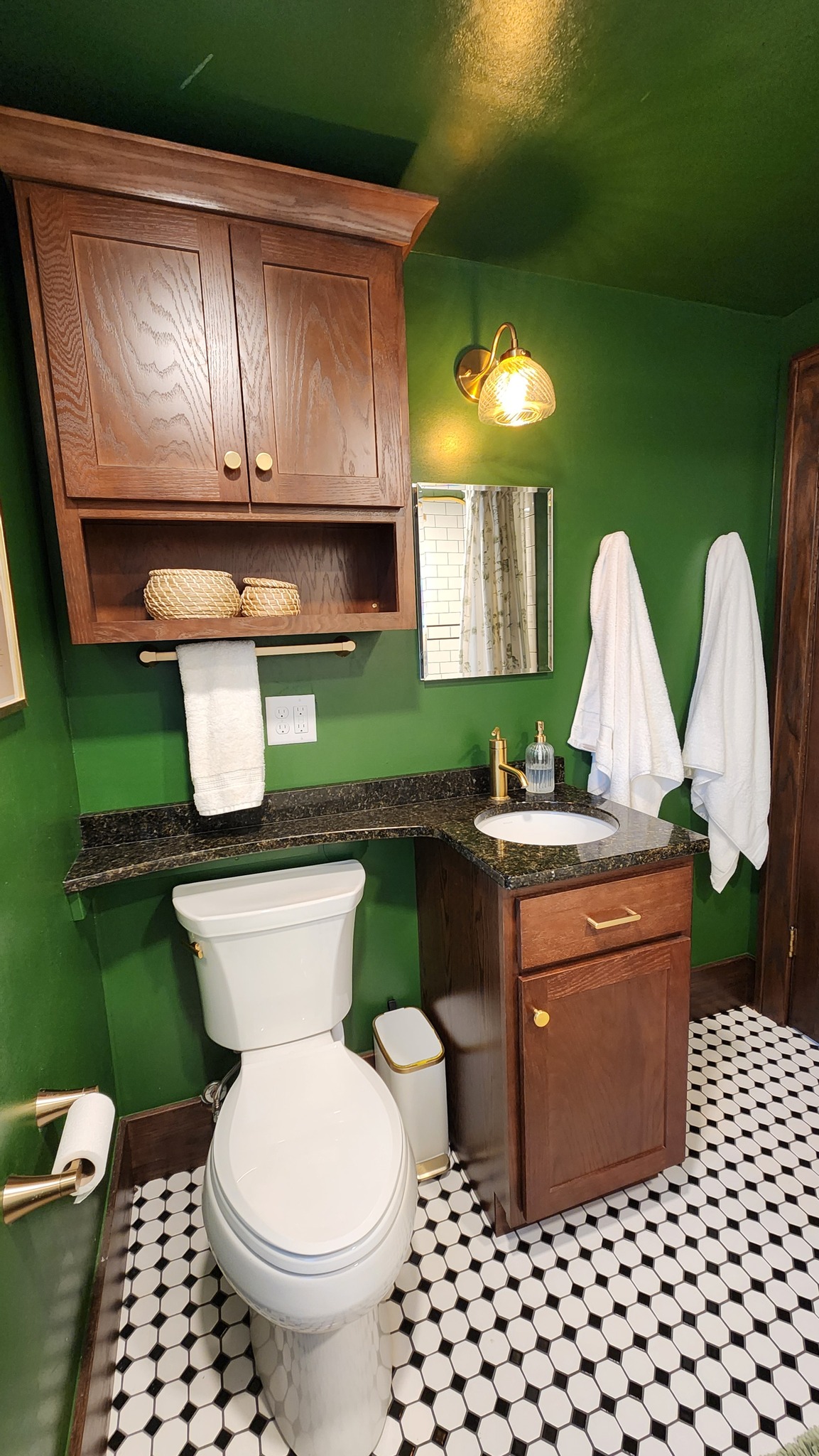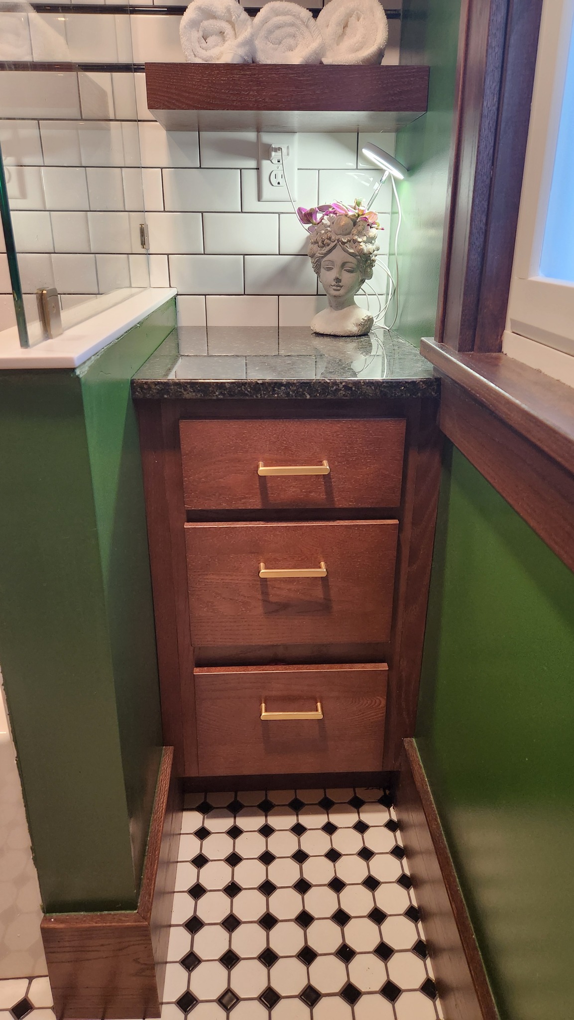 This homeowner was looking for more storage and countertop space in their small 1922 upstairs bathroom. They wanted to include vintage looking details while mixing in modern updated function.